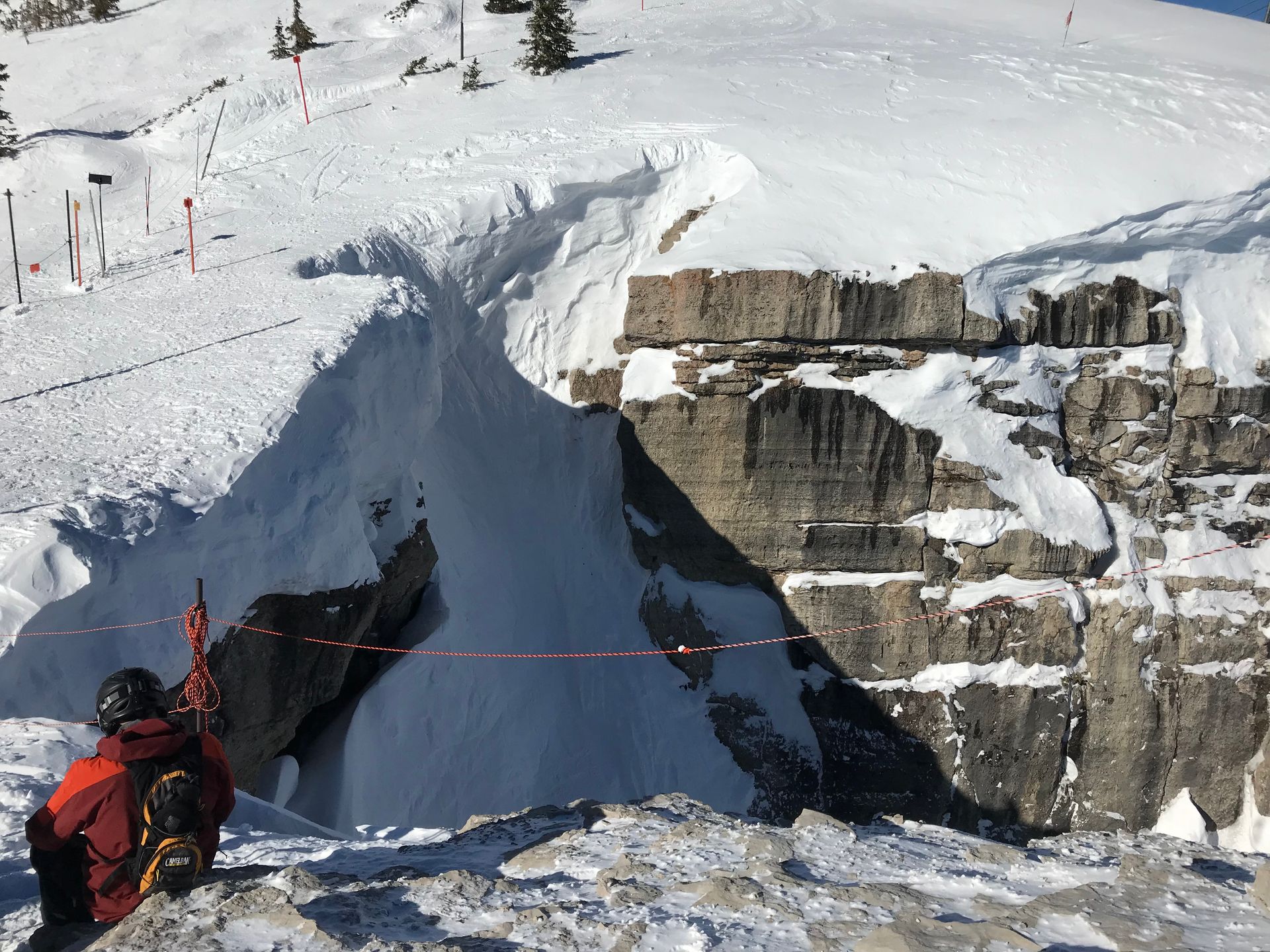 It’s a legendary run, and I was about to find out why. The entrance was roped off, but we could walk to the edge and see the drop. To get in, you have to literally jump from a cornice into a massively steep, narrow chute hemmed in by rock walls.